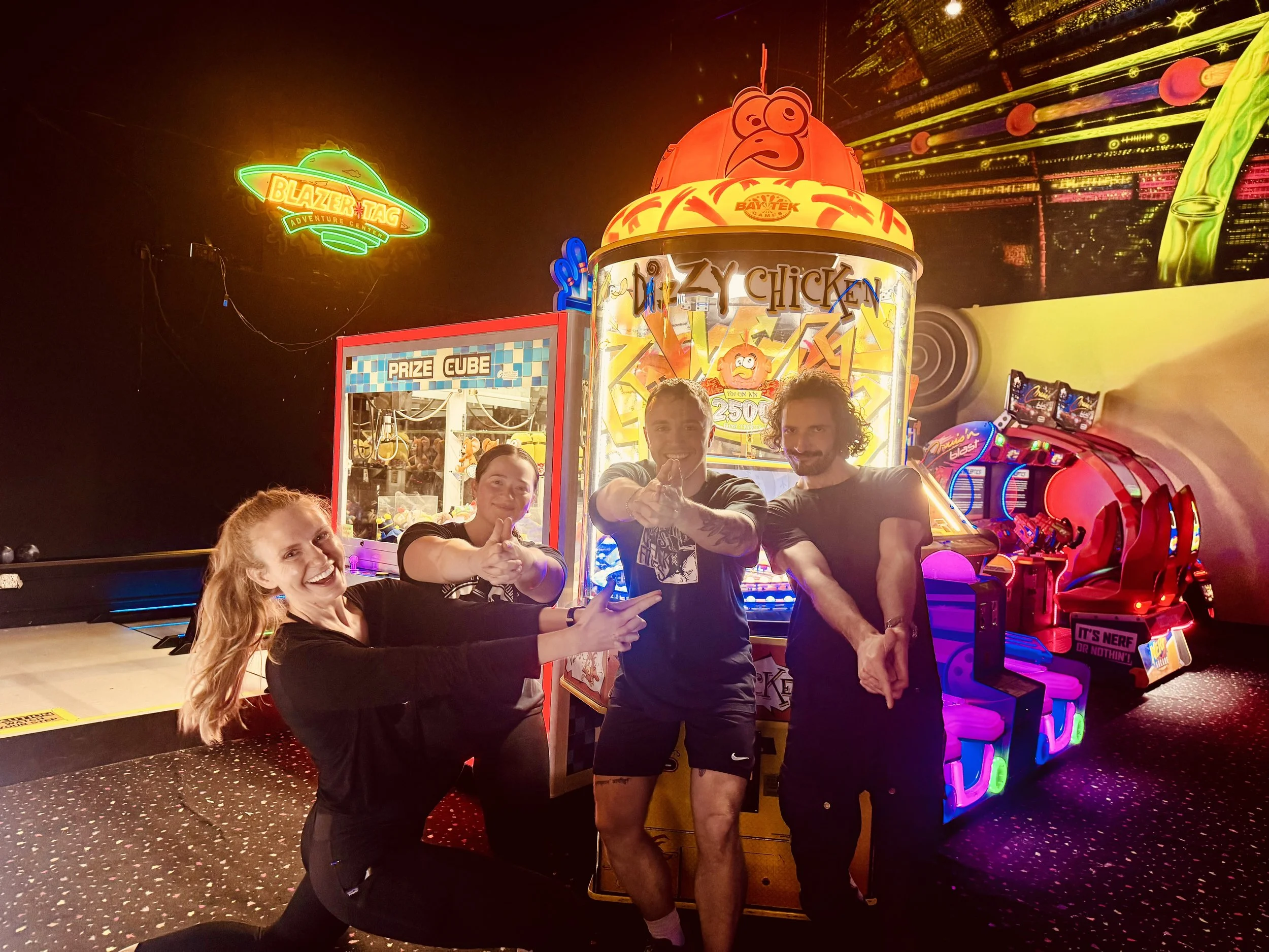 Alissa, Amy, Dustyn, and Calvin at a lab event playing laser tag! (2025)