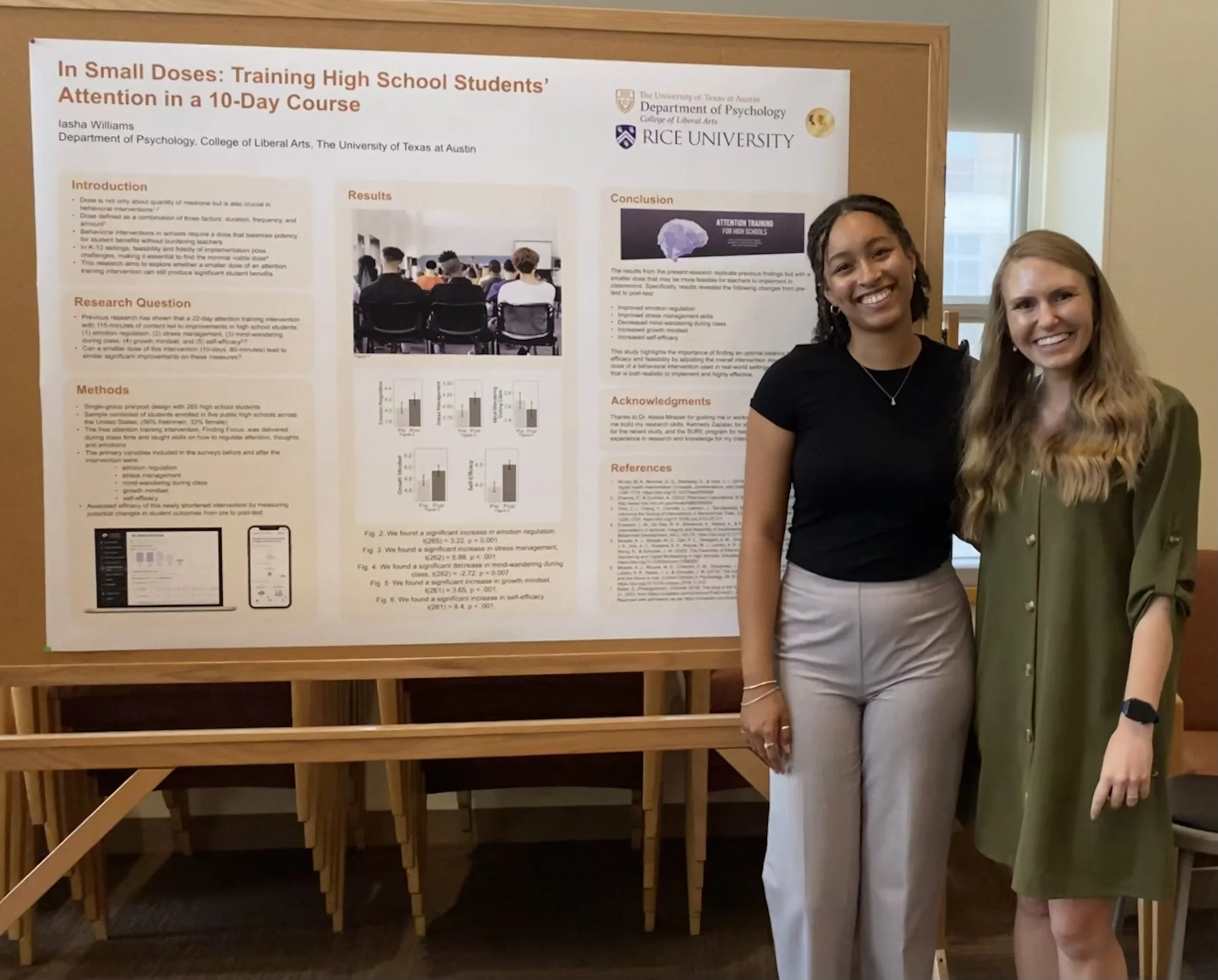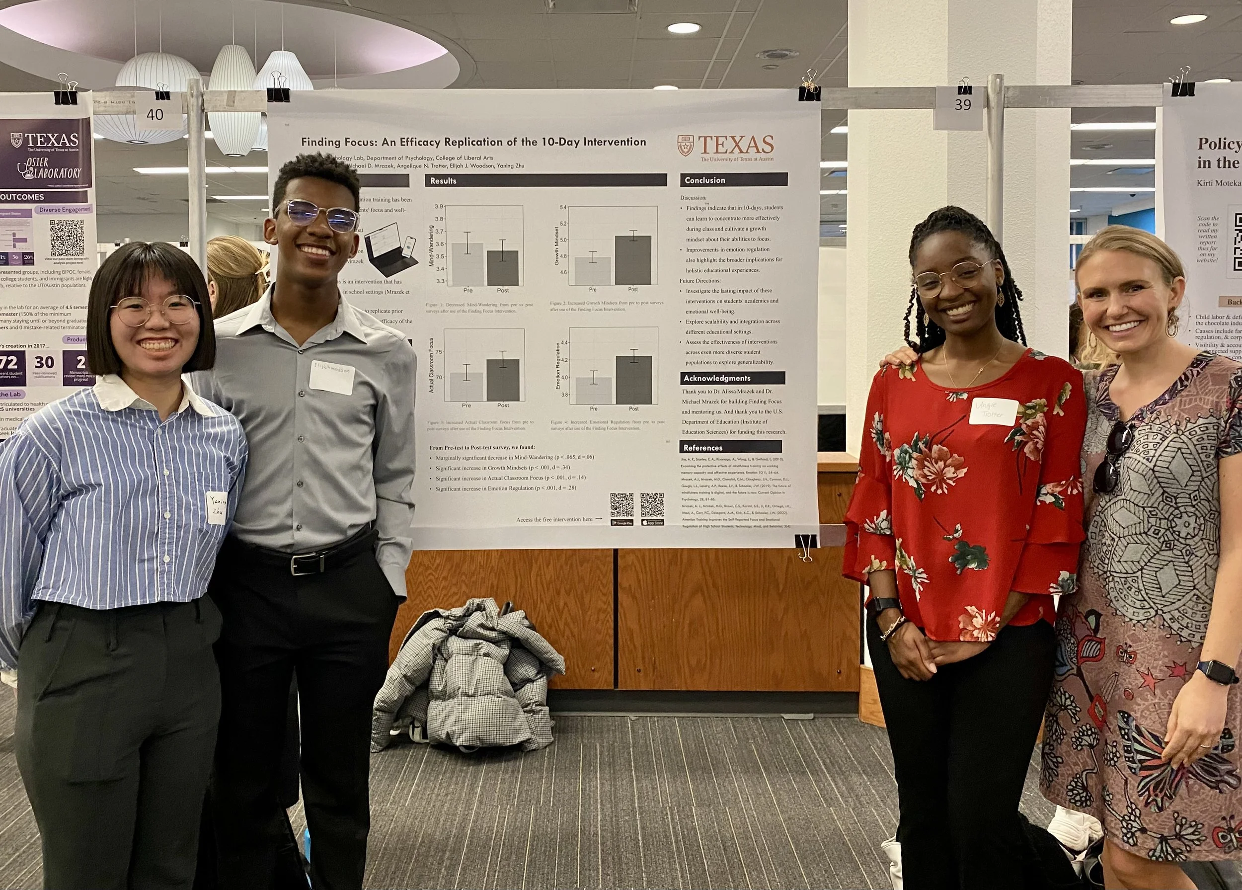 Dustyn graduated in May 2024 from UT Austin with a major in Psychology and a minor in Applied Statistical Modeling. In the Applied Psychology Lab, Dustyn utilizes his advanced R skills to assess the efficacy of Finding Focus—both the 10-Day Course and the Focus Coach— in classrooms nationwide. Dustyn hopes to obtain his Ph.D. in Clinical Psychology and is most interested in working with military and first responder populations. When not on campus, Dustyn likes to play soccer, watch new movies, and have a laugh with his friends.